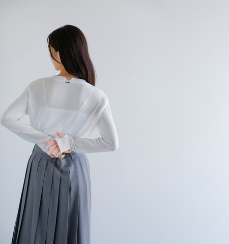 テンセル素材を使用し、しっとりとしたやわらかな肌触りが特徴。素肌に直接着ても快適で、レイヤードスタイルにも最適な素材感です。
