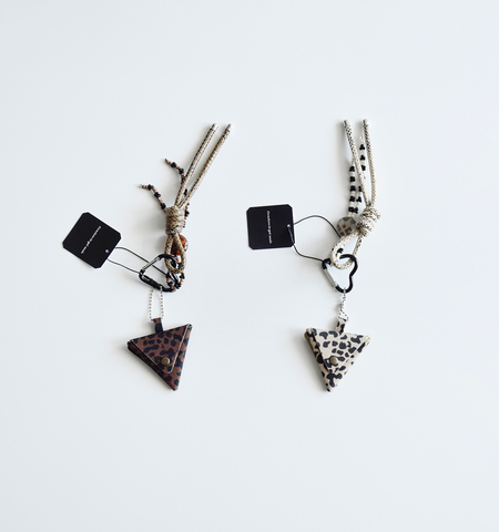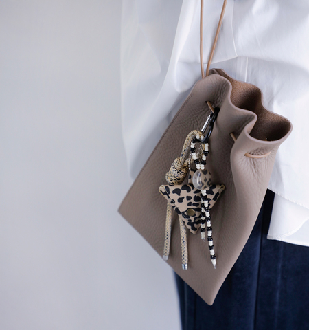 アニマルパターンの三角形ポーチが印象的な、洗練されたバッグチャーム。ビーズをあしらったコードや、ハート型のカラビナなど、さりげないディテールにこだわったデザインです。