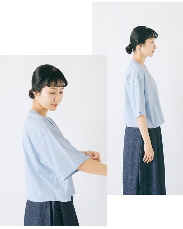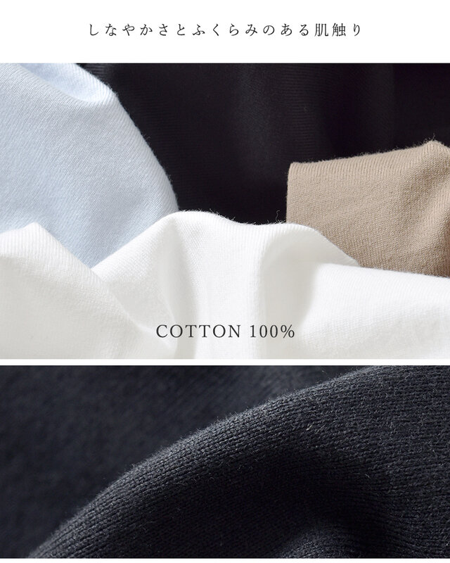 オーストラリア産の良質なコットンを使用した天竺編みで、しなやかさとふくらみのある肌触りが特徴です。柔らかく、肌への刺激が少ないため、デリケート肌でも着やすい素材感。速乾性もあるため、日常使いに便利です。