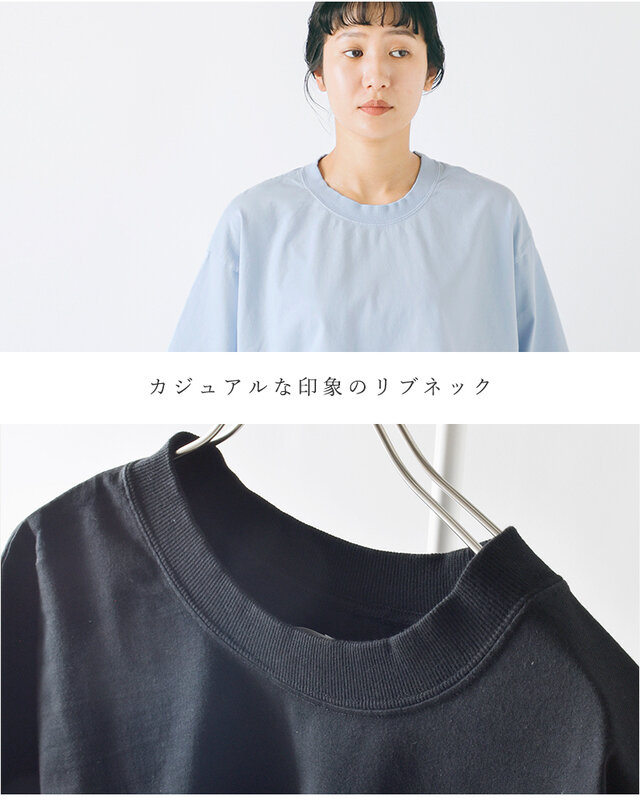 程よく開いたネックラインが、顔まわりをすっきり見せ、インナーとのレイヤードもしやすい仕様です。リブなしのミニマルな仕立てが、ナチュラルな雰囲気を引き立てます。