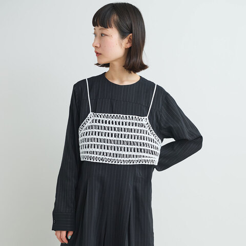 大き目の編地で存在感のある、綿ポリエステルテープヤーンを全面刺繍して仕上げたビスチェ。