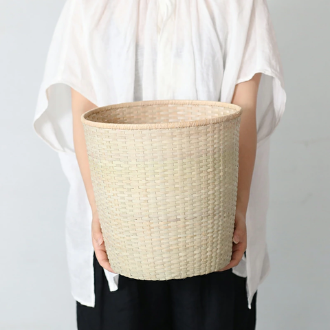 マダガスカル原産、大きく広げた葉が特徴的な「タビビトノキ」の葉で編まれた筒カゴです。