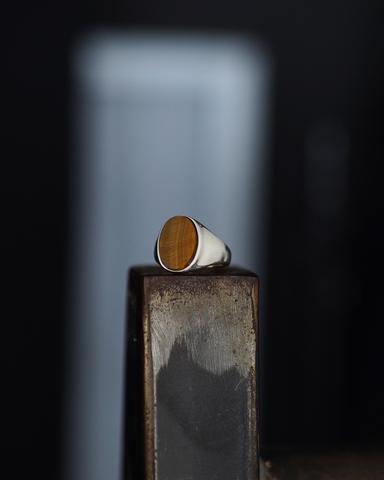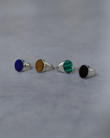 クラシックなオーバルのフェイスに、天然石のラピス、オニキス、マラカイト、タイガーアイをあしらったシグネットリング。