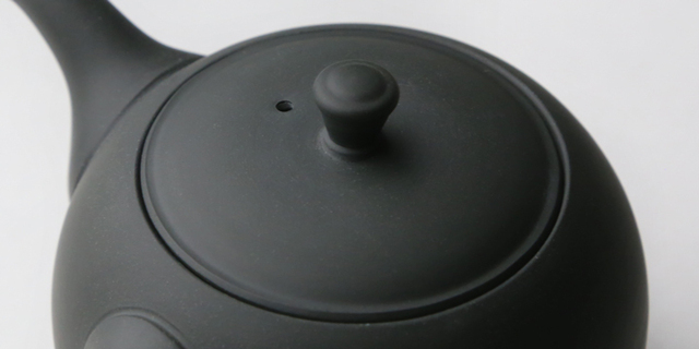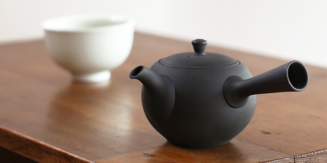 烏泥を焼き締めて作られた常滑焼の「丸急須 横手」。