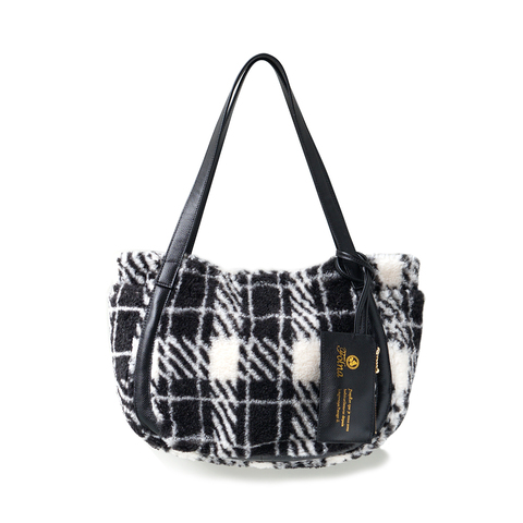 もこもこのムートン調のファーにチェック柄のプリント、こちらもふかふかで優しい肌ざわりです。