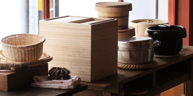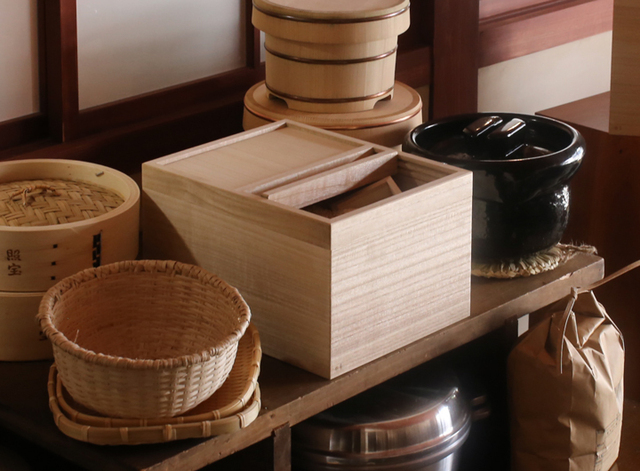 桐箱の端正な美しさが目をひく東屋の米櫃。