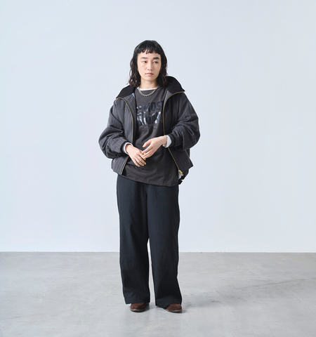 クラシックなハリントンジャケットをベースに、現代的なワイドシルエットへとアップデートした一着。色ごとに異なる3種の織り柄を採用し、奥行きのある表情をプラス。裏地には薄手の中綿を挟み、軽やかさとあたたかさを両立。衿裏とトリミングにはコーデュロイを配し、さりげない異素材使いでクラフト感も演出しています。裾はシャーリング仕上げで、丸みのあるやわらかなフォルムに。同シリーズのパンツとのセットアップで、トラッドに遊び心を添えたスタイルが完成します。