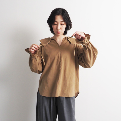 袖はふっくらとしたボリュームスリーブで、手首に寄せたギャザーとフリルカフスが女性らしさを引き立てるポイントに。