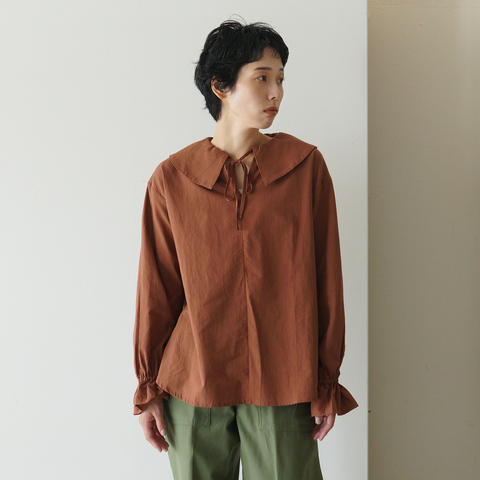 ふんわりと軽やかに揺れるローン素材が魅力の長袖ブラウス。柔らかく空気を含むような生地感で、動くたびに自然なドレープを描きます。