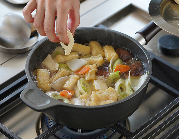 揚げ物は油の温度が下がりにくいので、少量の油でもカラッと揚げることができます。じゃがいもやカボチャなどの根菜は煮崩れることなくホクホクに。煮物は短い時間でも味がしっかり染みます。炒め物はフッ素樹脂加工でこびりつかず、ひっくり返すのも簡単。ぜひいつものレシピでお試しください。
