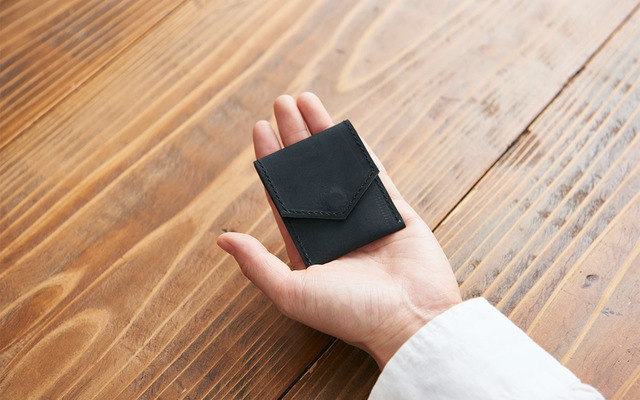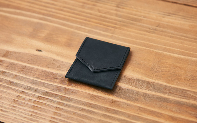 PINTレザーシリーズの最初の製品。シンプルな構造の封筒型のレザーケースです。1枚の革を折り、縫製して作っています。パーツもホックの留め部分だけが内側に出ているだけです。ホックも、厚みを抑えた薄いものを使っています。そのため、重量も軽く、仕切りもなく最小限の構造で余分なスペースもないため、自由に使っていただけます。