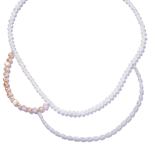 みずみずしい淡水パールとカラーパールを掛け合わせ、アーティに仕上げたネックレス。