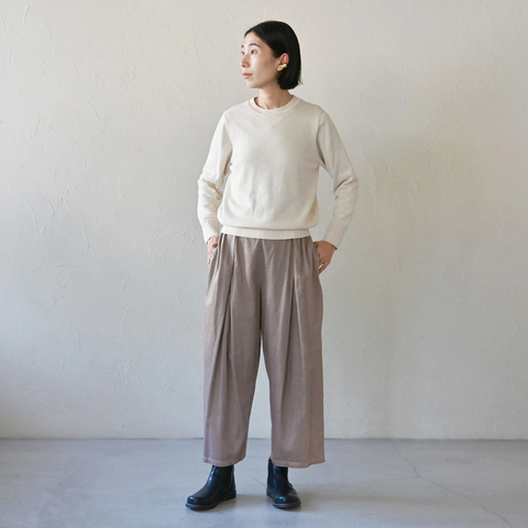 ナチュラルカラーのコットンニットと合わせたシンプルなスタイル。