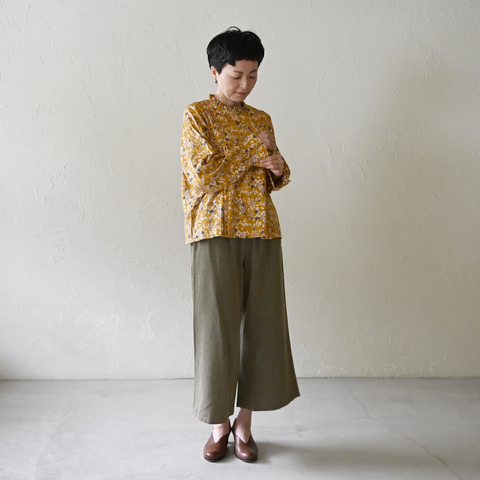 レトロな雰囲気を残すガーゼのワイドパンツとの組み合わせ。
