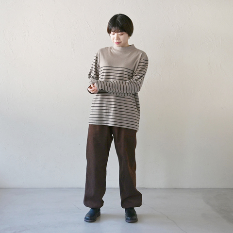 タートルネックほど首が隠れないので、秋の始まりに着やすい一枚です。