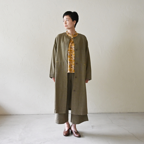ゆったりとした身幅。長めの丈。ノーカラー。