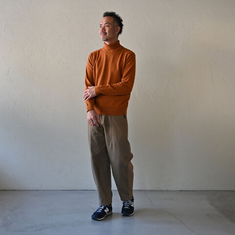 ダークオレンジのタートルトップにベージュのパンツと合わせて優しい印象に。