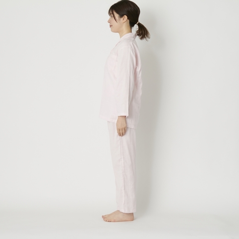 「和晒二重ガーゼパジャマ」は和晒を施したガーゼ生地のパジャマです。生地にストレスをかけずに丁寧に不純物を取り除くため、ふんわりとした優しい肌ざわり。ウエストには伸びの良いゴムを使っているから、締め付け感がありません。