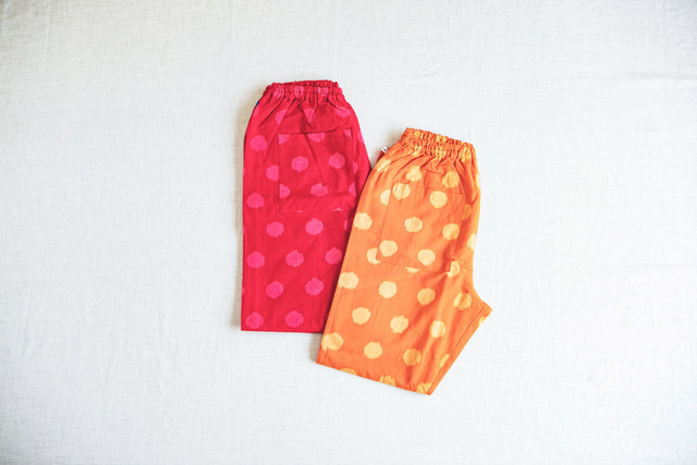 使用しているのは、福岡・筑後地方の伝統織物・久留米絣。職人の手仕事によって織り上げられた生地に、遊び心のある配色や大胆なデザインを取り入れ、伝統と現代感覚を軽やかにミックスしました。