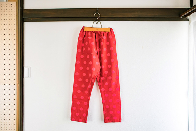 もんぺとしての機能性はそのままに、股上はゆったり、足元はすっきりと細身。ウエストはゴム+ひも仕様で着心地もらくらく。日常使いはもちろん、イベントや旅先など、ちょっと気分を上げたいときにぴったりの一本です。