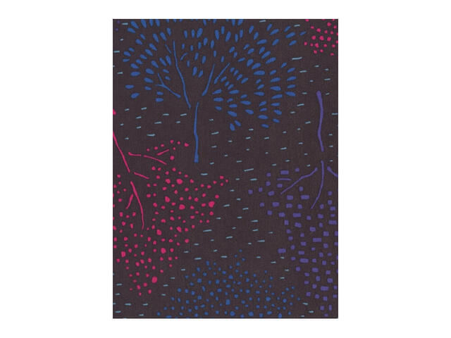 深い森に、そっと足を踏み入れたときのような、静けさと神秘を感じさせるデザイン。墨色のようなグレーベースに、青や紫、ピンクで表現された樹々が浮かび上がるように広がります。リズムよく並ぶ点と線が、葉や木の実、風に揺れる枝葉を思わせ、どこか夜の森を歩いているかのような感覚に。