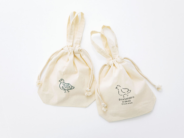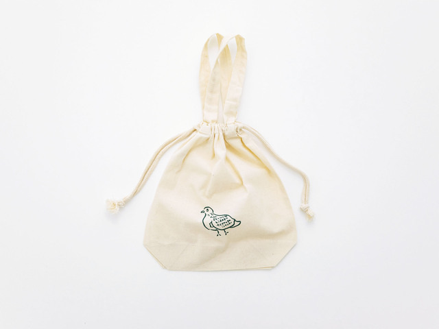 ちょこんと佇む、伝所鳩のロゴ入り巾着袋。