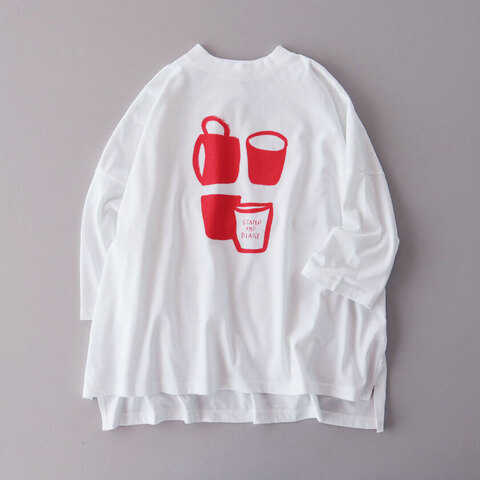 フロントにはモノやオブジェを楽しげに並べたイラストがプリントされています。一枚で着るのはもちろん、カーディガンやジャンパースカートを重ねてプリントをのぞかせても可愛いですよ◎
