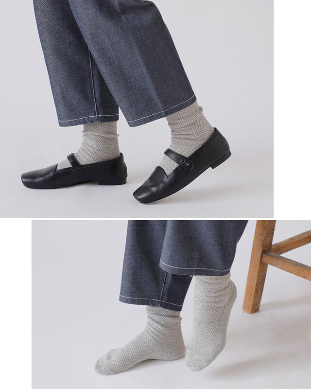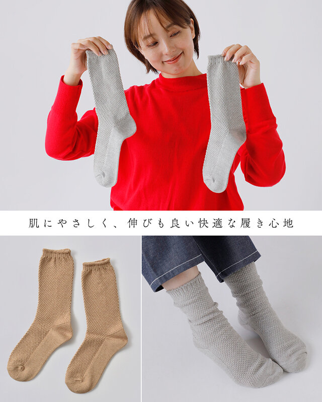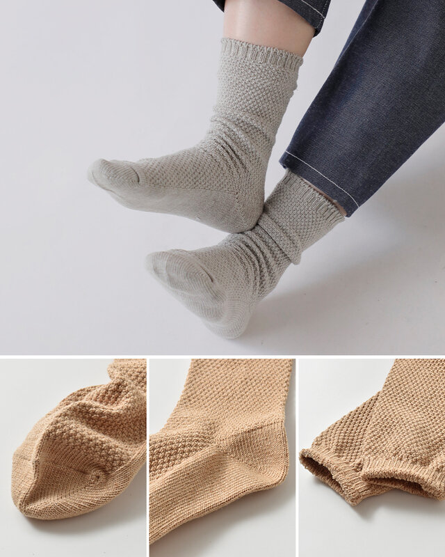 肌に心地よく寄り添う鹿の子編みソックス。独特の凹凸感が魅力の鹿の子編みは、通気性に優れ、ムレにくく快適な履き心地。オールシーズン心地よく過ごせる、シンプルで飽きのこないデザインです。