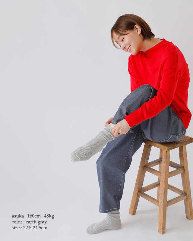 締めつけ感が少なく、程よく伸びるフィット感で、リラックスした履き心地をお楽しみいただけます。ナチュラル志向の方や、肌が敏感な方にもおすすめの、やさしさあふれるソックスです。