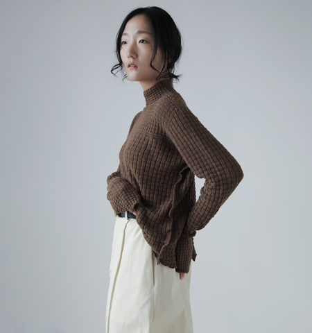 脱脂感のあるさっぱりとした質感です。コットンらしいソフトな肌触りで通気性も良く春・秋にも着やすく、暖冬にもぴったりの生地感です。高い伸縮性があり、しなやかに伸びるので身体の動きを制限せず、タートルニットの窮屈感を軽減しています。洗濯の弱水流で洗えて、シワになりにくい素材でので、気負いなく着られるのも嬉しいポイントです。