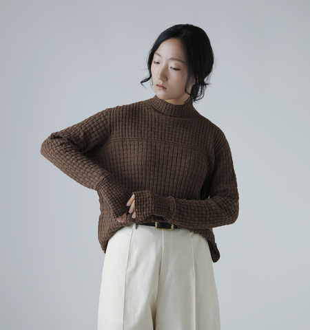 籠模様をイメージした立体的な編み柄をホールガーメント機で編み立てました。表情感のあるさらっとした風合いの綿混ブークレ素材で快適さが持続するため、長いシーズン着用できます。
