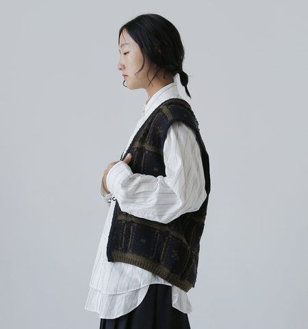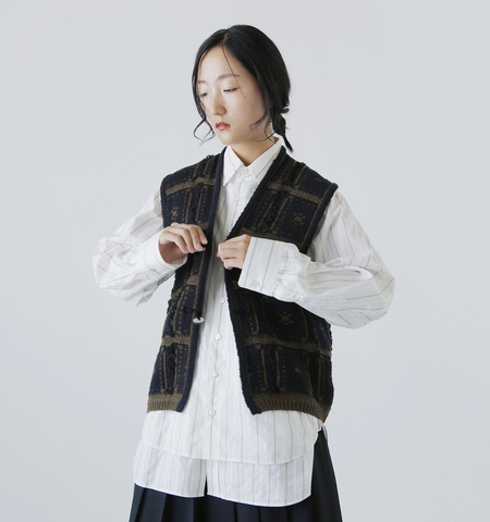 前開き仕様のため着脱が簡単で、シャツやブラウスとの相性抜群。落ち着いた配色で暖かみのあるデザインが装いに個性的な雰囲気を添えてくれます。