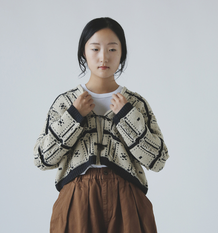 羽織りやすいように着丈と袖丈は少し短め、アームホールは少し大きめに設定してあります。落ち着いた配色で暖かみのあるデザインが装いに個性的な雰囲気を添えてくれます。