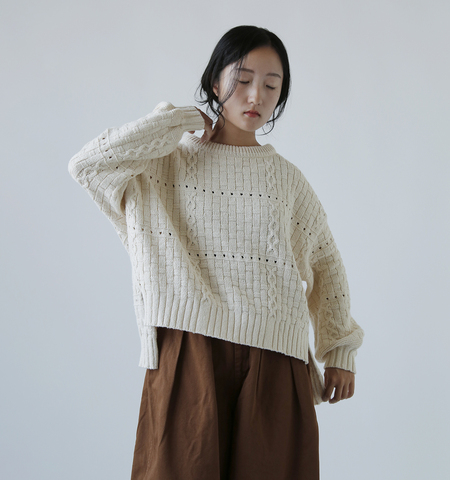 シンプルながら編地に拘りを感じるニットプルオーバーです。ゆるい雰囲気で着られてクセがなく、軽い着心地と通気性の良さのため、暖冬でもニットを着て季節らしい装いを楽しめます。