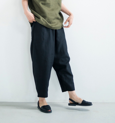 このリネンパンツは、ウェストはゆったりとしたゴム仕様で、ウェストを調整できるゴム紐が内側についています。そのため、体形の変化にもしっかり対応できます。