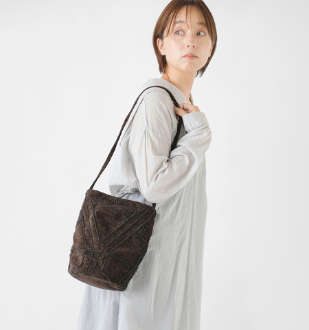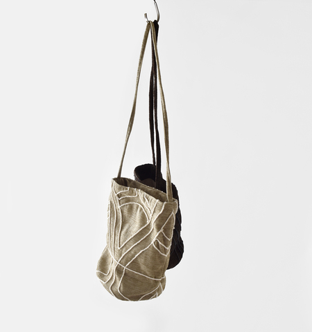 インドの伝統手法である立体的な刺繍で、大きく模様を描いたデザイン。細いショルダーは肩にもかけやすい長さで、結んで手に持つ事も出来る2way仕様。ナチュラルながらも印象的なバッグです。