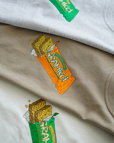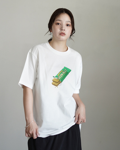 カジュアルコーデに遊び心を添える、グラノーラバーをモチーフにしたユニークなプリントTシャツ。
