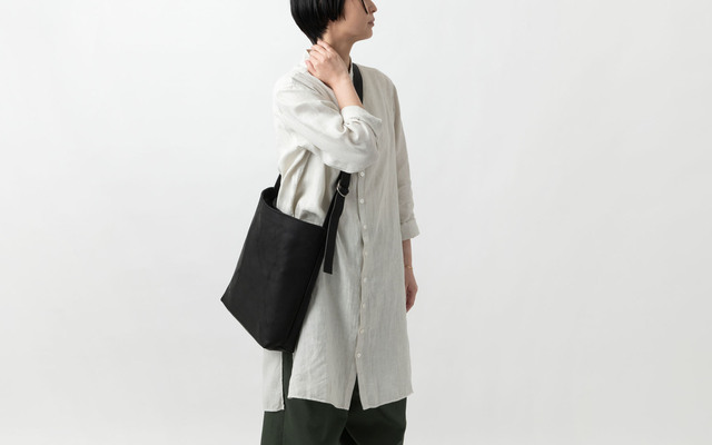 レザーの質感をそのままに残し、ラフに、タフに使えるよう、できるだけパーツ部品は用いない仕様にしています。ショルダー紐の調節部分は、ダブルリングのベルトにヒントを得て作りました。この仕様のため、調節幅は大きくはありませんが、お好みに合わせて紐の長さを調節可能です。紐は、短く斜めがけできるイメージで作っています。(モデル身長160cm)