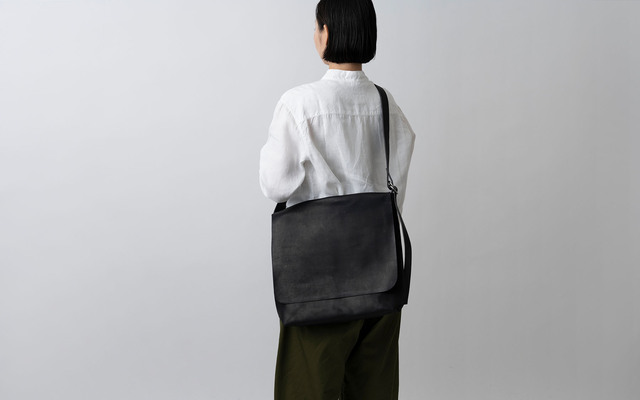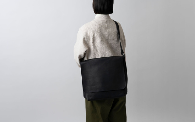 レザーの質感をそのままに残し、ラフに、タフに使えるよう、できるだけパーツ部品は用いない仕様にしています。ショルダー紐の調節部分は、ダブルリングのベルトにヒントを得て作りました。この仕様のため、調節幅は大きくはありませんが、お好みに合わせて紐の長さを調節可能です。着用写真は、最短の状態です。紐は、短く斜めがけできるイメージで作っています。(モデル身長160cm)