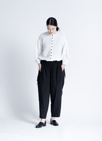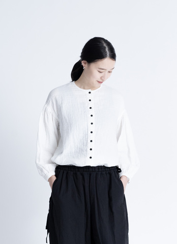 胸元には小さなボタンをひとつひとつ並べ、袖にはやわらかなギャザーを寄せました。