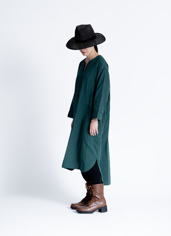 身幅はゆったり、バスト寸120cm。けれど後ろに深いタックを入れて、横からの姿もすっきりとしています。首もとはキーネックにして、顔まわりを引き締めます。寒い日にはタートルネックを重ねて、首元に色や素材を添えても楽しめる万能な一着。
