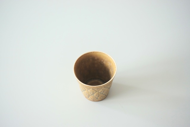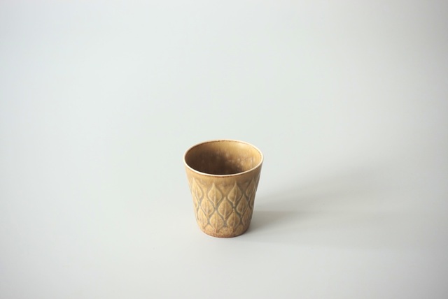 レリーフシリーズの魅力はなんといっても、深いカフェオレ色のグラデーションが目をひく釉薬の味わいと、静かに並ぶ葉っぱのモチーフの取り合わせ。