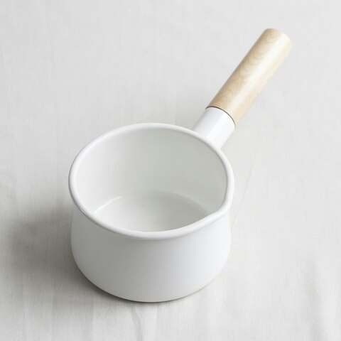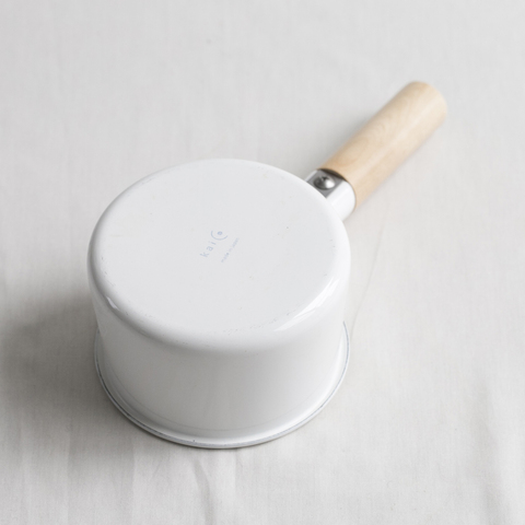 琺瑯の清潔的な印象と、木のあたたかさが調和した、kaicoのミルクパン。角が丁寧に落とされた白木の持ち手はすべすべと気持ちよく、キッチンに置いてあるだけで嬉しくなるようなビジュアルをしています。