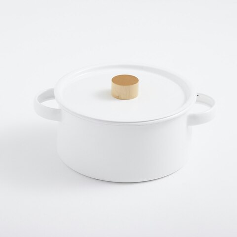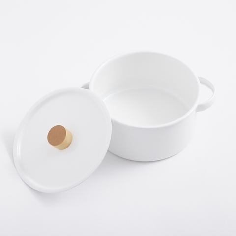 そこでおすすめしたいのが、小泉誠さんがデザインし、墨田区の老舗金属加工工場がつくる琺瑯×木の調理器具シリーズ「kaico(カイコ)」の両手鍋です。可愛げのある見た目と、金属にガラス質の釉薬を焼き付けた琺瑯だからこその熱伝導や保温性といった時短調理に役立つ機能性の両方を備えた一品。じっくり煮込んでも、匂いがつきにくいのも嬉しい特徴です。