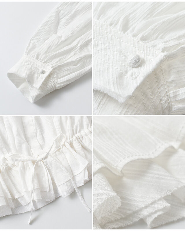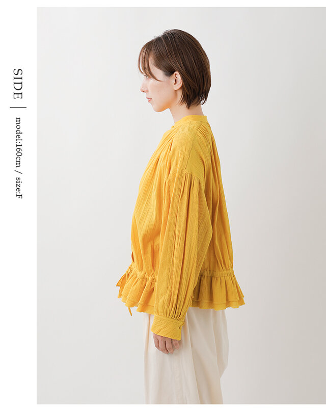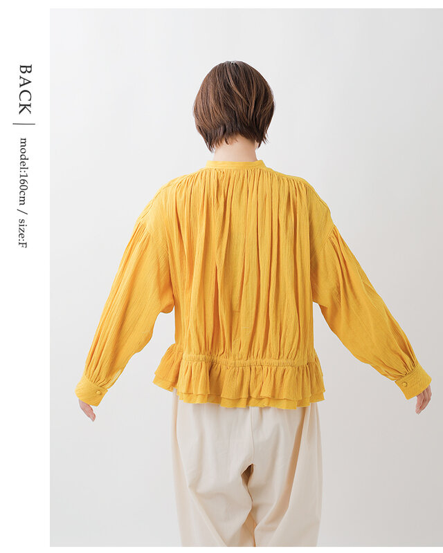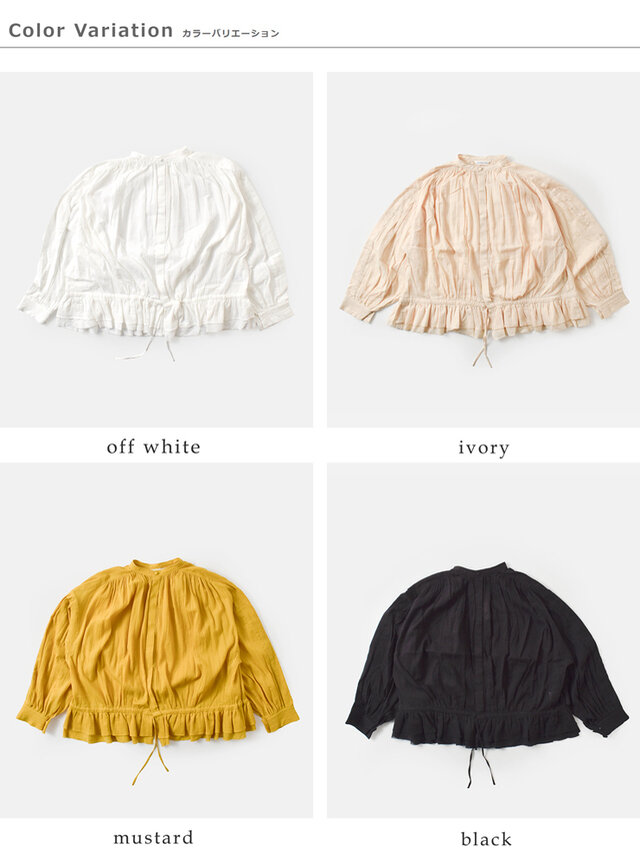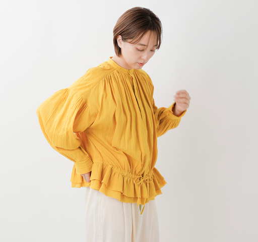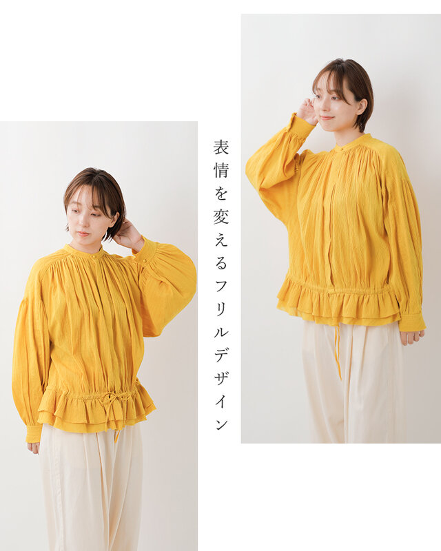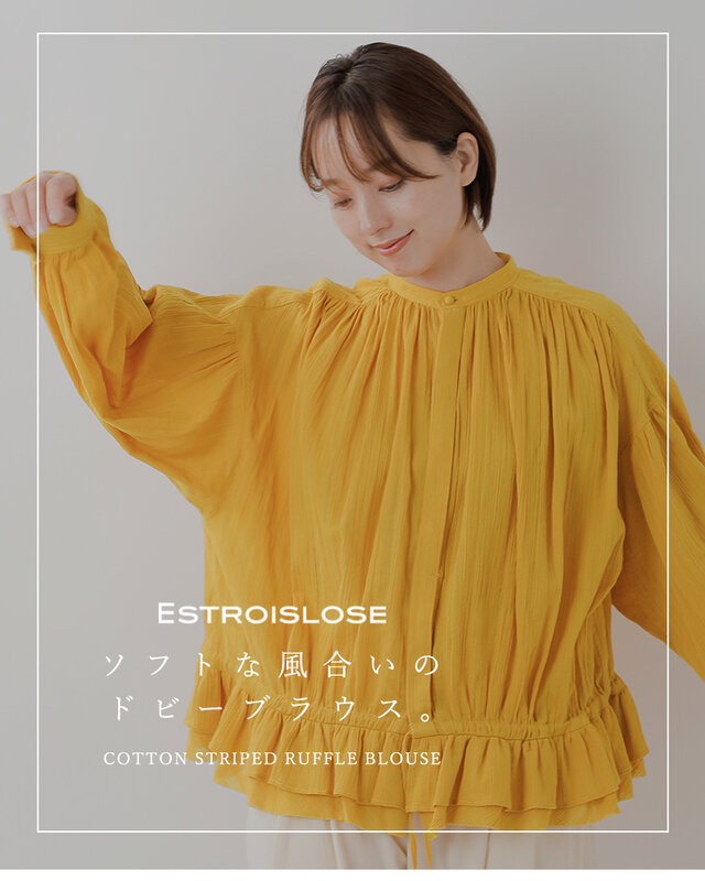 生地には、柔らかく軽やかな着心地のコットンドビーストライプを使用。上品な透け感と、ドビー織りならではの独特な凹凸感が魅力です。ゆとりのあるシルエットが生み出す、美しいドレープが華やかな印象を演出。随所に施されたギャザーや、フリル仕立ての裾、可愛らしいボタンなど、フェミニンなディテールもポイントです。透け感をいかして柄物やカラ―インナーを合わせれば、軽やかなレイヤードスタイルに。秋冬にはスウェットやニットを重ね、裾のフリルをちらりと見せる着こなしもおすすめです。