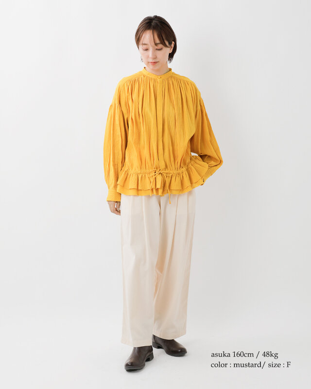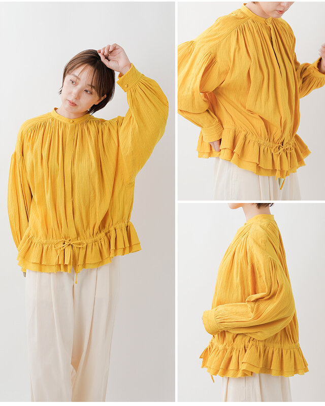 立体感のあるストライプ生地に、贅沢にギャザーをあしらったデザイン。首元や袖口には細やかなタックを、裾には軽やかなフリルを配し、動きと華やかさを感じる立体的なフォルムに仕上げました。