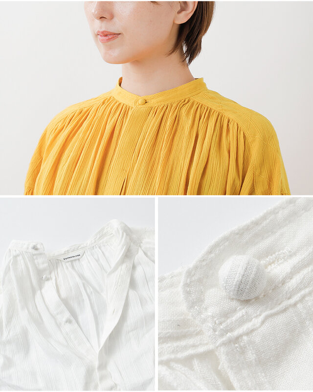 首元は丸みを帯びた柔らかなスタンドカラーで、ボタンが隠れた比翼仕立てによりすっきりとした印象に仕上げました。一番上のくるみボタンは、さりげなく首元に溶け込み、可愛らしいアクセントを添えています。