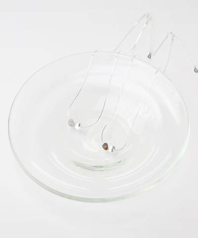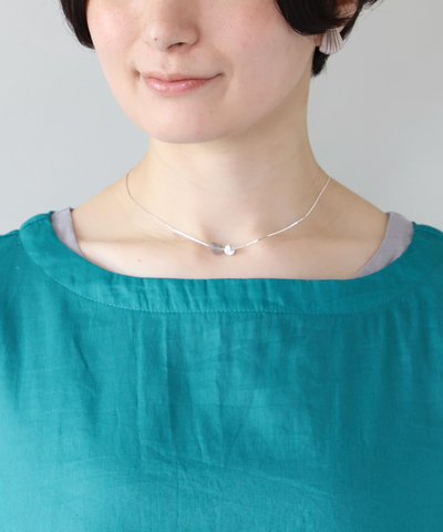 光沢が美しいシルバーのチェーンに小ぶりで控え目なストーンのネックレスは、胸元に優しいアクセントを添えてくれます。