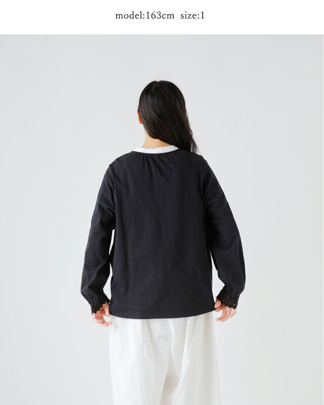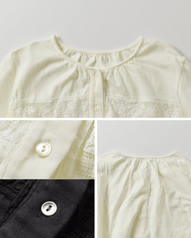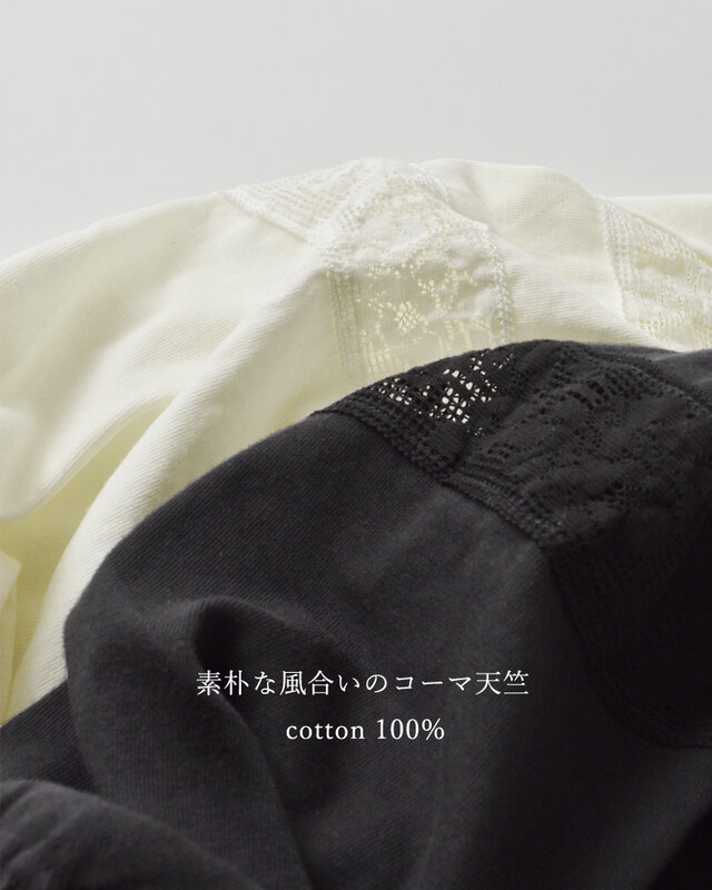 コットン100%のコーマ天竺にコットンレースを組み合わせて、作り上げてから染め仕上げしています。素材の素朴な良さとレースの美しさを楽しめるシリーズです。ナチュラルで優しい印象で、レイヤードで様々なスタイリングをお楽しみいただけます。