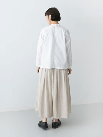 素材の特徴を活かしたシンプルなタックスカート。ウエストはゴム紐仕様のストレスフリーな穿き心地に。クタッとした柔らかな生地感が広がりすぎないきれいなラインを作り出し、タックの収まりが良いのでお腹周りをすっきりとまとめます。両サイドはポケット付きです。